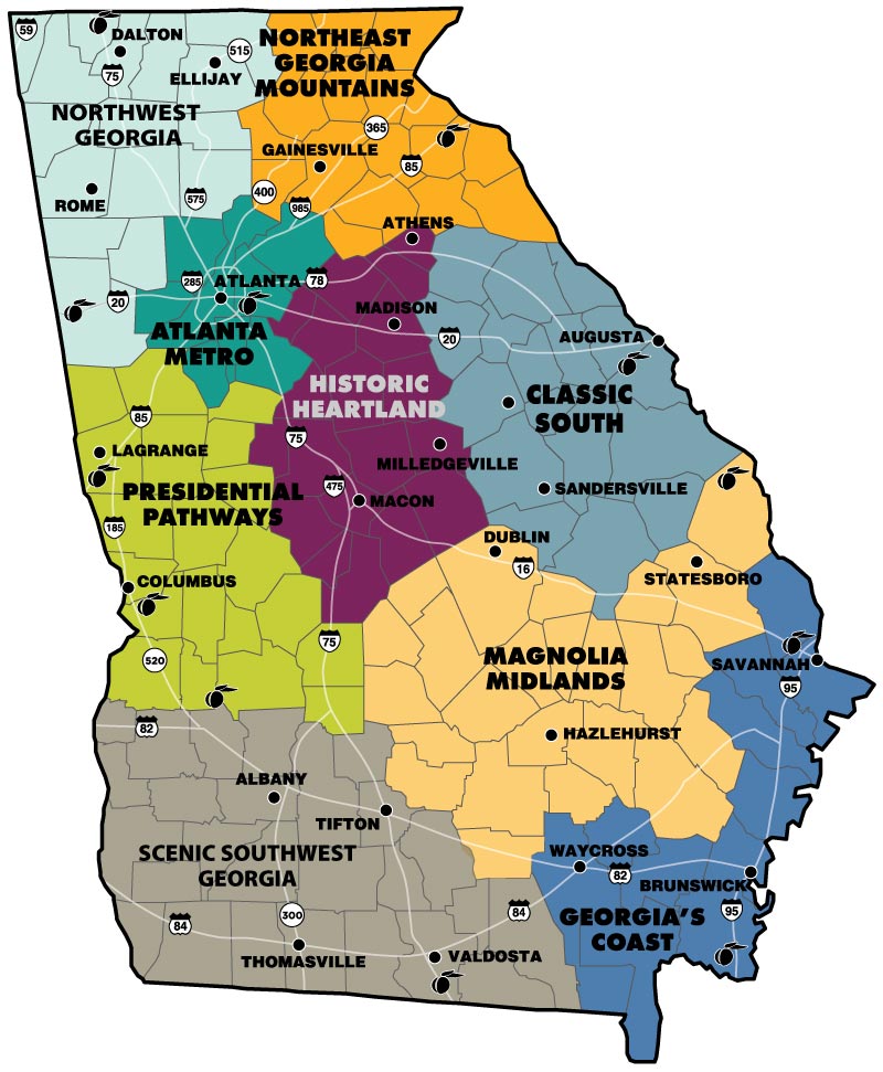 Regions are determined by the Georgia Department of Economic Development. See its online calendar at exploregeorgia.org for additional events.